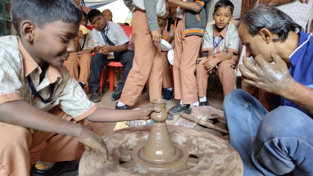 Students experimenting with hydroponic setups, painting eco-themed murals, and molding clay in open classrooms surrounded by greenery