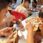Students experimenting with hydroponic setups, painting eco-themed murals, and molding clay in open classrooms surrounded by greenery